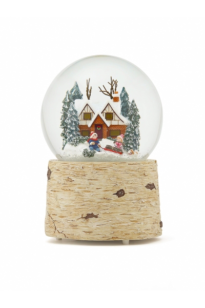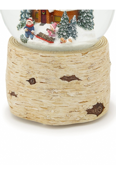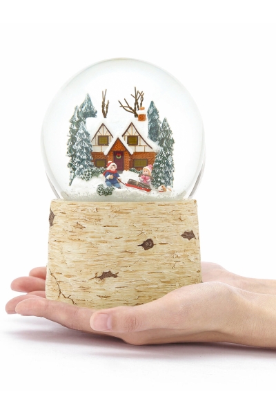 Une ambiance hivernale féerique – un charmant chalet enneigé aux fenêtres illuminées, entouré de sapins couverts de neige et d’enfants jouant joyeusement devant le perron. Toute la magie des vacances de Noël se concentre sous ce dôme de verre, recréant la chaleur et la tendresse des soirées d’hiver.