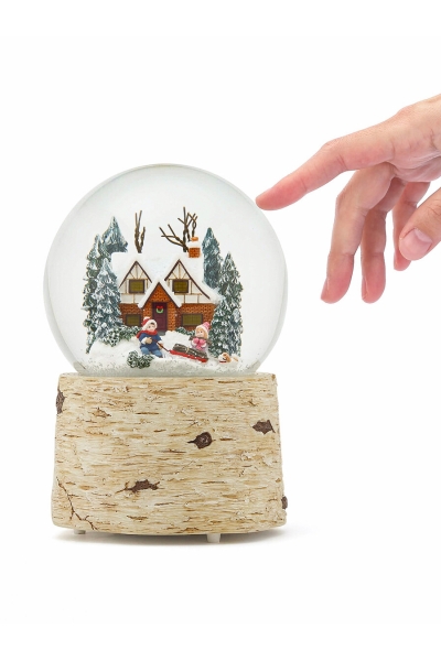 Mais plus important encore, en appuyant sur le bouton situé à la base de la boule à neige, un véritable conte d’hiver prend vie : la neige commence à tomber doucement tandis que les fenêtres du petit chalet s’illuminent d’une lueur dorée et réconfortante.