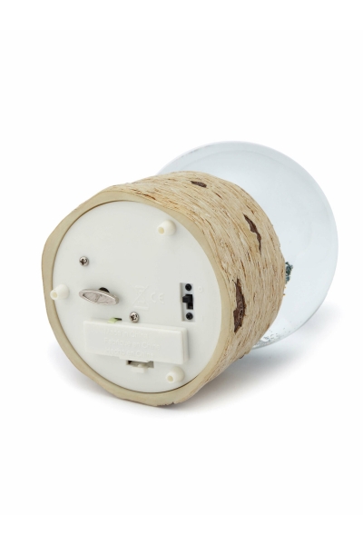 Grande boule à neige de Noël avec ampoule en verre (Ø 12 cm) — inutile de la secouer, la neige tombe automatiquement grâce au mécanisme auto-blizzard. Le rétroéclairage et le système de neige tournante fonctionnent avec deux piles AA (non incluses).