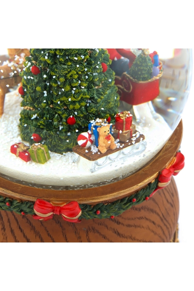 Sous le dôme de verre se trouve une scène de Noël lumineuse : un sapin joliment décoré de boules rouges et de guirlandes dorées. À son pied reposent des cadeaux et des jouets, parmi lesquels un petit ourson en peluche. À côté, le Père Noël trône dans son traîneau rouge finement orné, prêt à s’élancer avec ses rennes pour distribuer les présents à travers le monde.